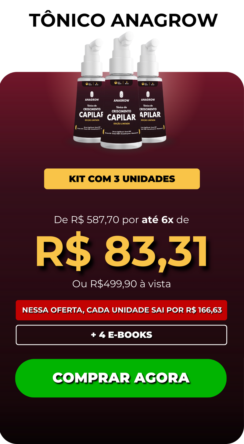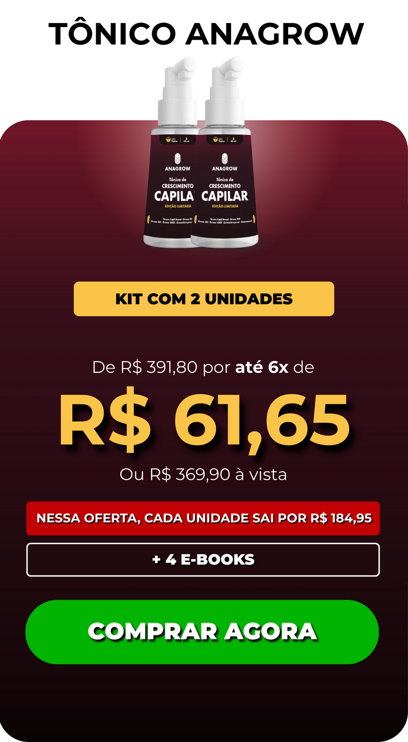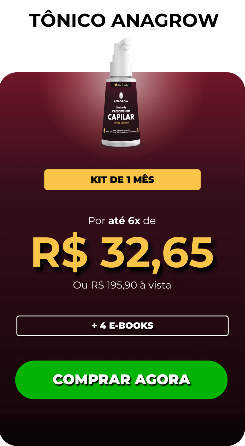 O Tônico de Crescimento Capilar Anagrow revitaliza o couro cabeludo e estimula o crescimento de novos fios. Tudo isso sendo fácil de aplicar, sem pesar, sem cheiro e sem efeitos colaterais.