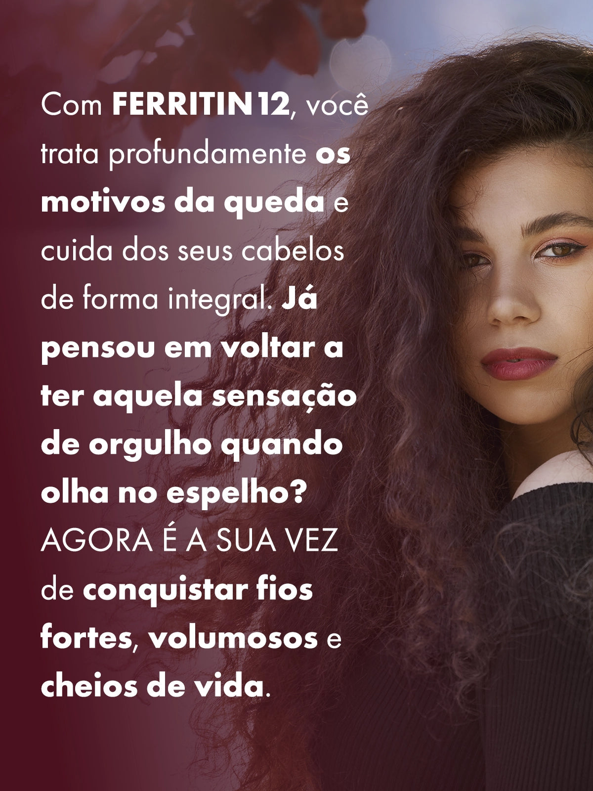 Ferritin12 atua corrigindo deficiências nutricionais que provocam queda intensa, como falta de ferro, biotina e vitaminas do complexo B, estimulando a produção de queratina para fios mais fortes e resistentes.